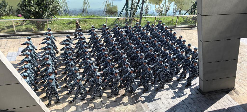 “整體保持!準(zhǔn)備合練!”訓(xùn)練場上的口令褪去了往日的糾正意味,滿是成竹在胸的沉穩(wěn)。新生們裹著迷彩列陣,肩線平直如尺,指尖緊貼褲縫,踢腿時膝蓋繃得筆直,連擺臂的高度與弧度都像復(fù)刻般精準(zhǔn)。教官們穿行其間,不過偶爾抬手輕觸學(xué)員肘部,微調(diào)那幾近完美的姿態(tài);耳畔早已沒了初時的雜沓,只剩“踏——踏——”的步聲厚重整齊,每一步都踩在同一節(jié)奏上,轉(zhuǎn)體時整排人同步轉(zhuǎn)身,衣擺揚(yáng)起的角度分毫不差,一眼望去,便是支已然成型、只待登場的分列式隊(duì)伍。
