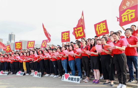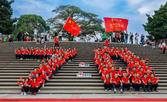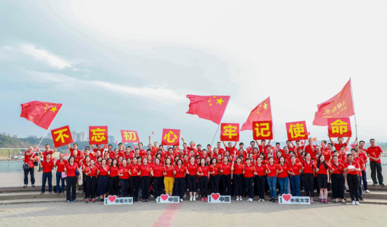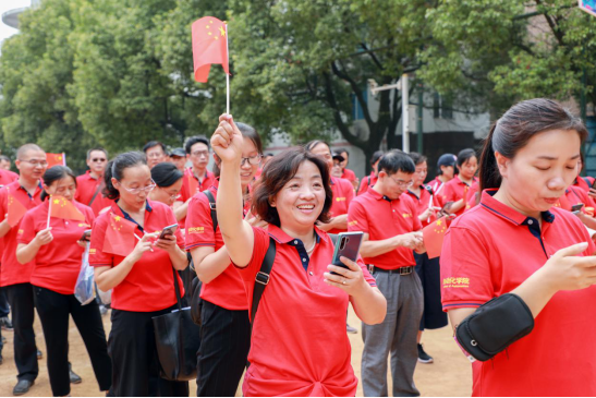 競(jìng)賽部分的活動(dòng)完成,全體教職工列隊(duì)望江臺(tái)上,在楚天千里的金秋下,桂花的香氣如碧波般洶涌而來(lái)。大家看著面前祖國(guó)的大好河山,不禁心潮澎湃,一同舞動(dòng)手中的國(guó)旗呼喊:“祖國(guó),生日快樂(lè)!”祝福的余音撒播在金秋的江面。而后所有教職工揮舞著國(guó)旗朗誦毛主席詩(shī)詞《沁園春·長(zhǎng)沙》,齊唱《歌唱祖國(guó)》。飽滿(mǎn)的激情、嘹亮的詩(shī)歌合誦,引得過(guò)往路人也紛紛駐足觀看,并忍不住一同誦唱。