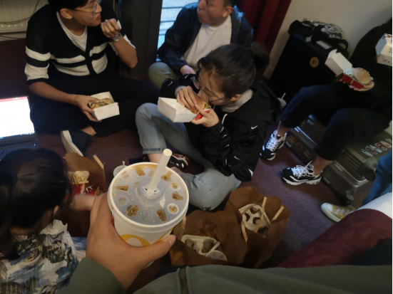 此行我們?nèi)胱〉氖堑蹏砉さ乃奚幔覀冎鲃臃艞壠票顒樱ゾo時間繼續(xù)排練。七個人坐在單間宿舍的地毯上,耷拉著眼皮子啃漢堡,沒想到倫敦第一餐就是麥當(dāng)勞快餐。那晚我時差還沒調(diào)整過來,只睡了四個小時就醒來了。我望著窗外一片黑漆漆,想象即將到來的比賽。好在大家發(fā)揮穩(wěn)定,在County Hall的第一次pitch以中秋節(jié)開場,引起了大家的共鳴,獲得評委和觀眾的好評和掌聲,我們心中的大石頭才放下。